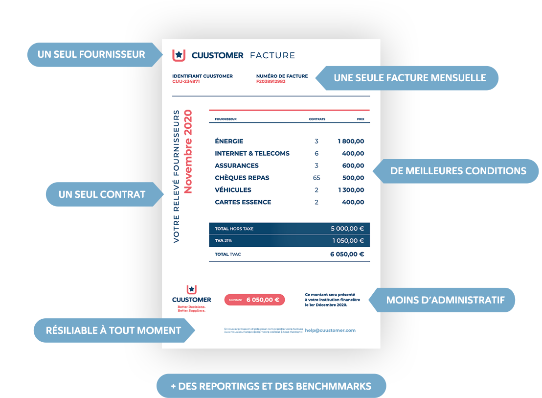 Début 2020, nous avons lancé un outil simple et efficace de gestion des achats. En quelques clics, rassemblez gratuitement tous vos contrats fournisseurs sur Cuustomer. Découvrez le rating de vos fournisseurs, soyez alerté de vos échéances contrats et résiliez vos contrats en un clic!